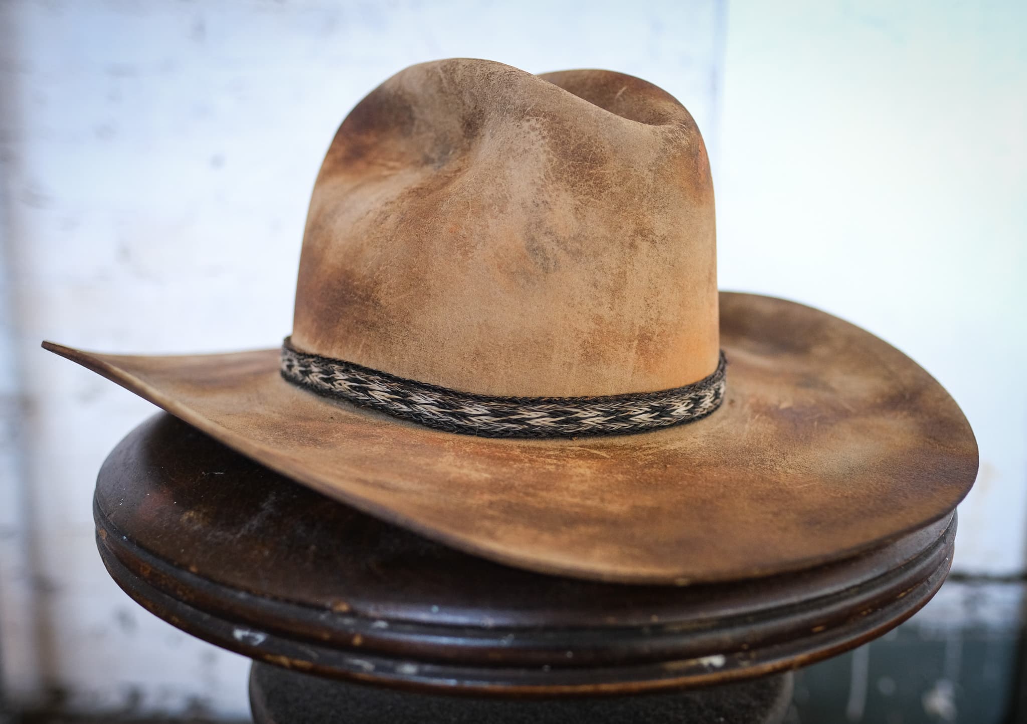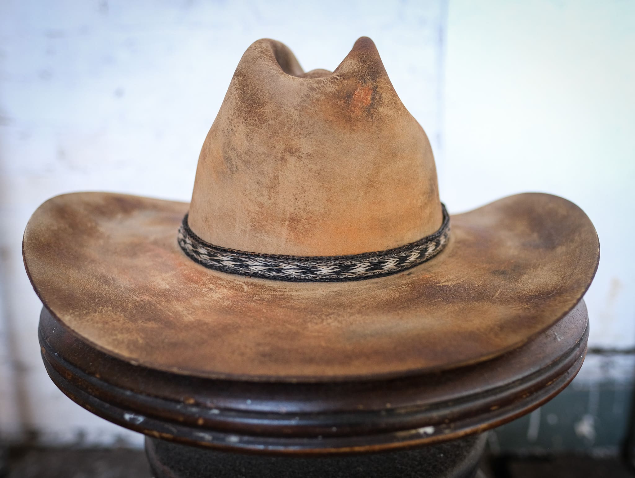 Check out the Ghouls hat from the Fallout TV show! This wide-brimmed western wild piece is the epitome of rugged, post-apocalyptic style. Made from distressed felt using clay and burning, it carries the marks of a hard life with frayed edges and a worn, weathered look. The faded band around the crown adds a touch of character, now cracked and dulled by time. This hat’s grimy, tattered finish gives it a genuine, lived-in feel, perfect for anyone looking to capture that wasteland spirit.