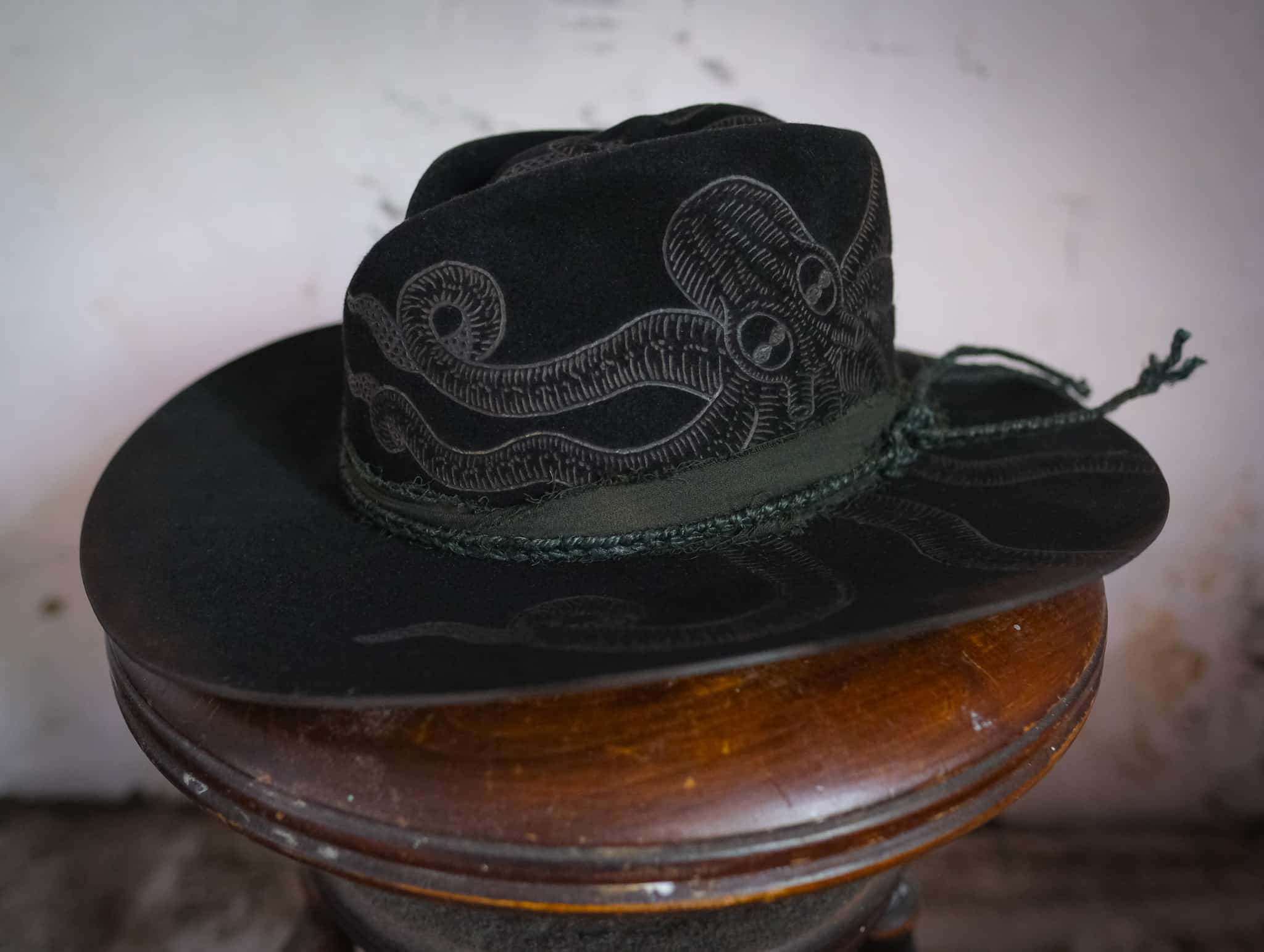 Description: A dark take on our Kraken Hat. Wider brim and with a Skull impressed on top, this hat has you ready for the high seas.