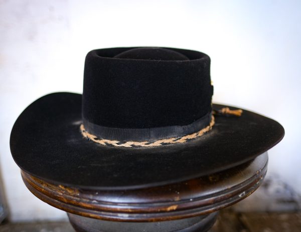 Description: Our version of the iconic Johnny Ringo hat from Tombstone. This hat is a little wild, a little western, and all fun. With an asymmetrical telescope top and a mean kick over the shooting eye, you will feel just like Johnny Ringo himself.