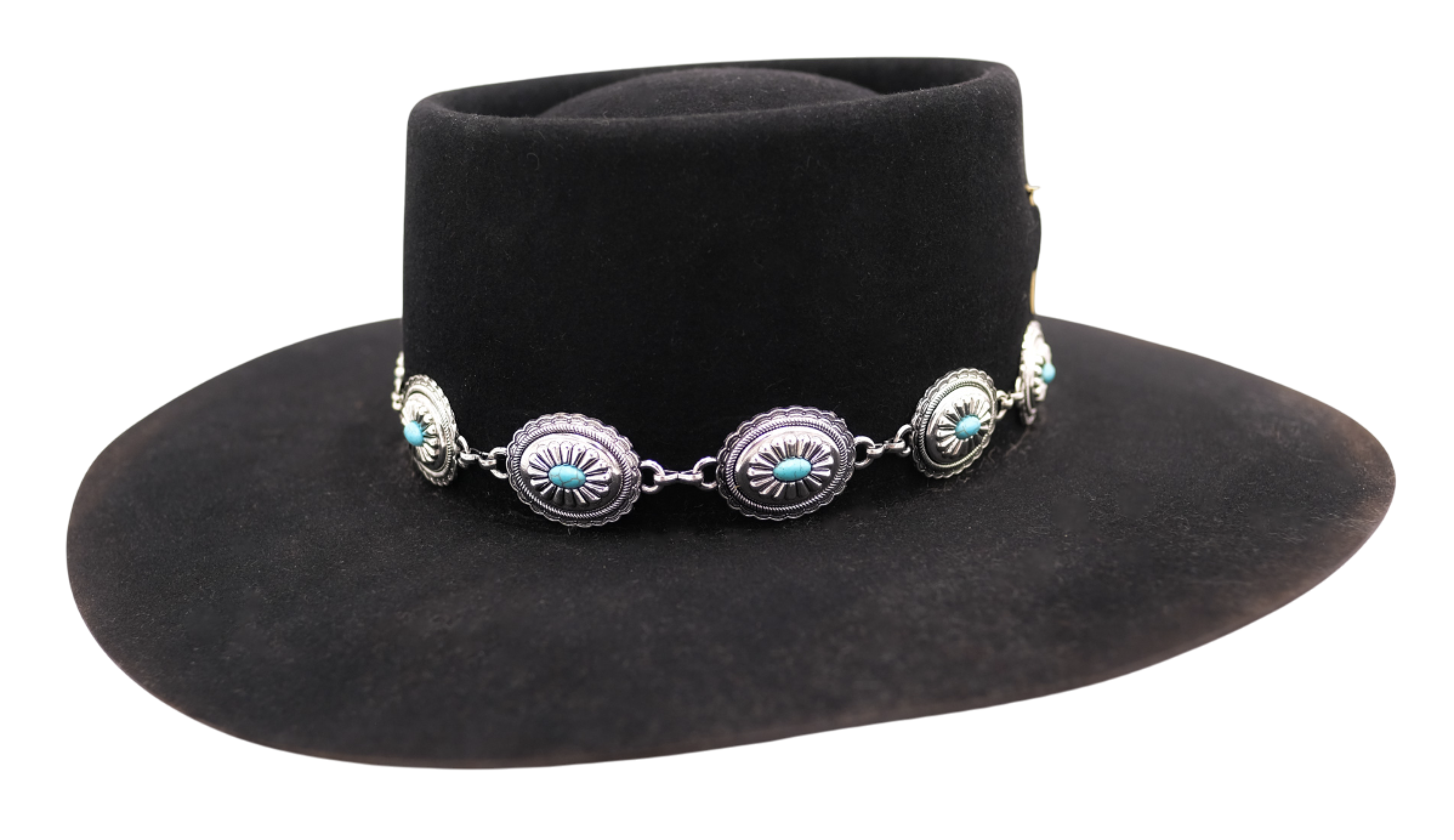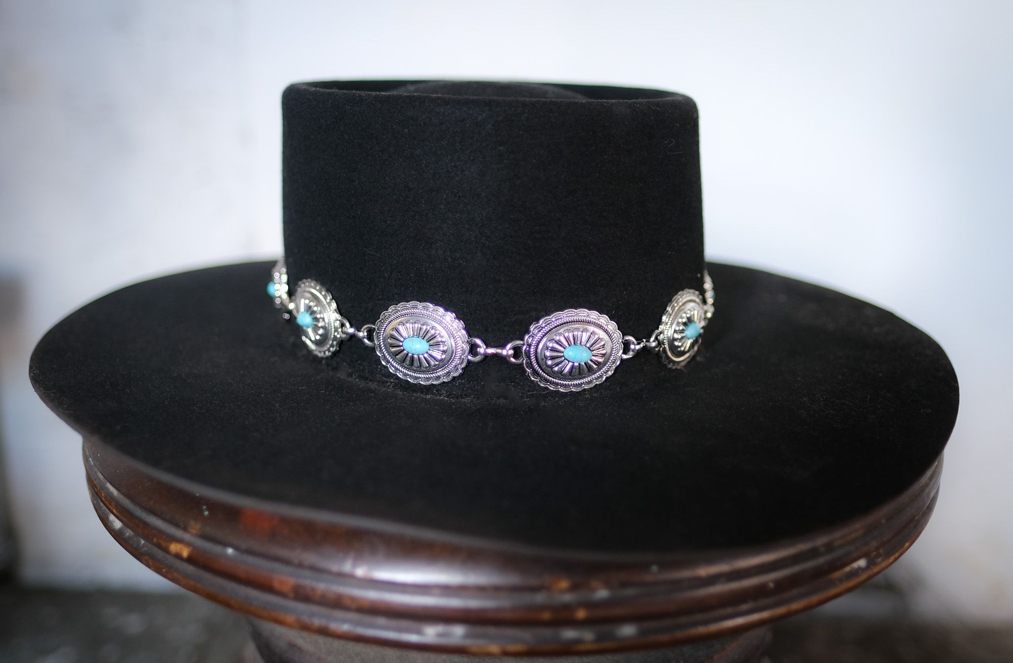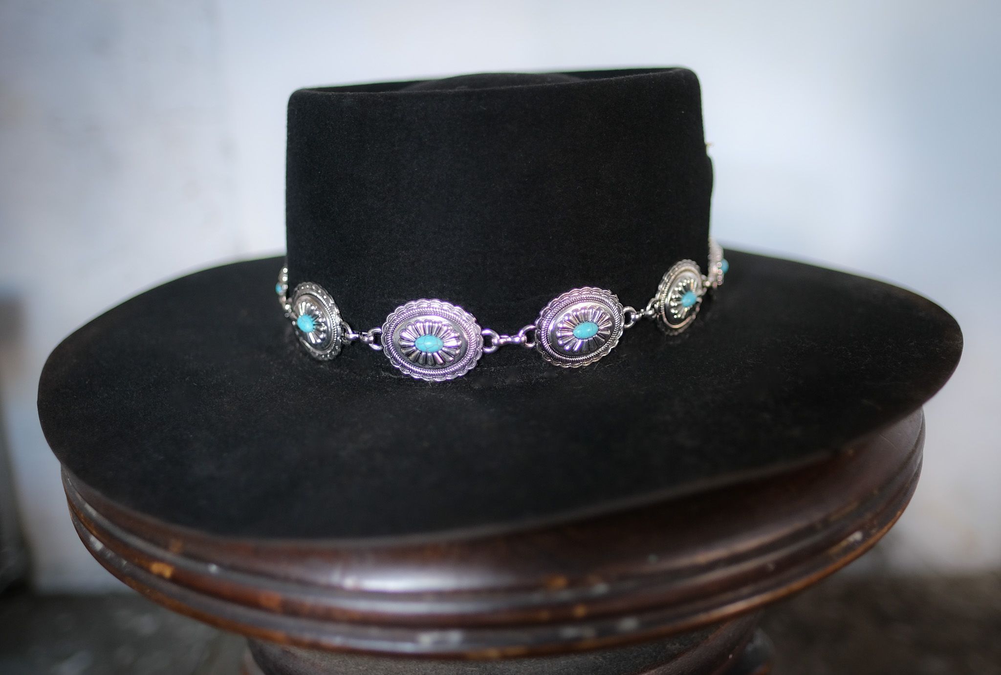 Description: Inspired by Stevie Ray Vaughn’s Texas Flood hat. With a classic telescope top, and a signature Turquoise Concho band, this hat will have you ready for a night out on the town.