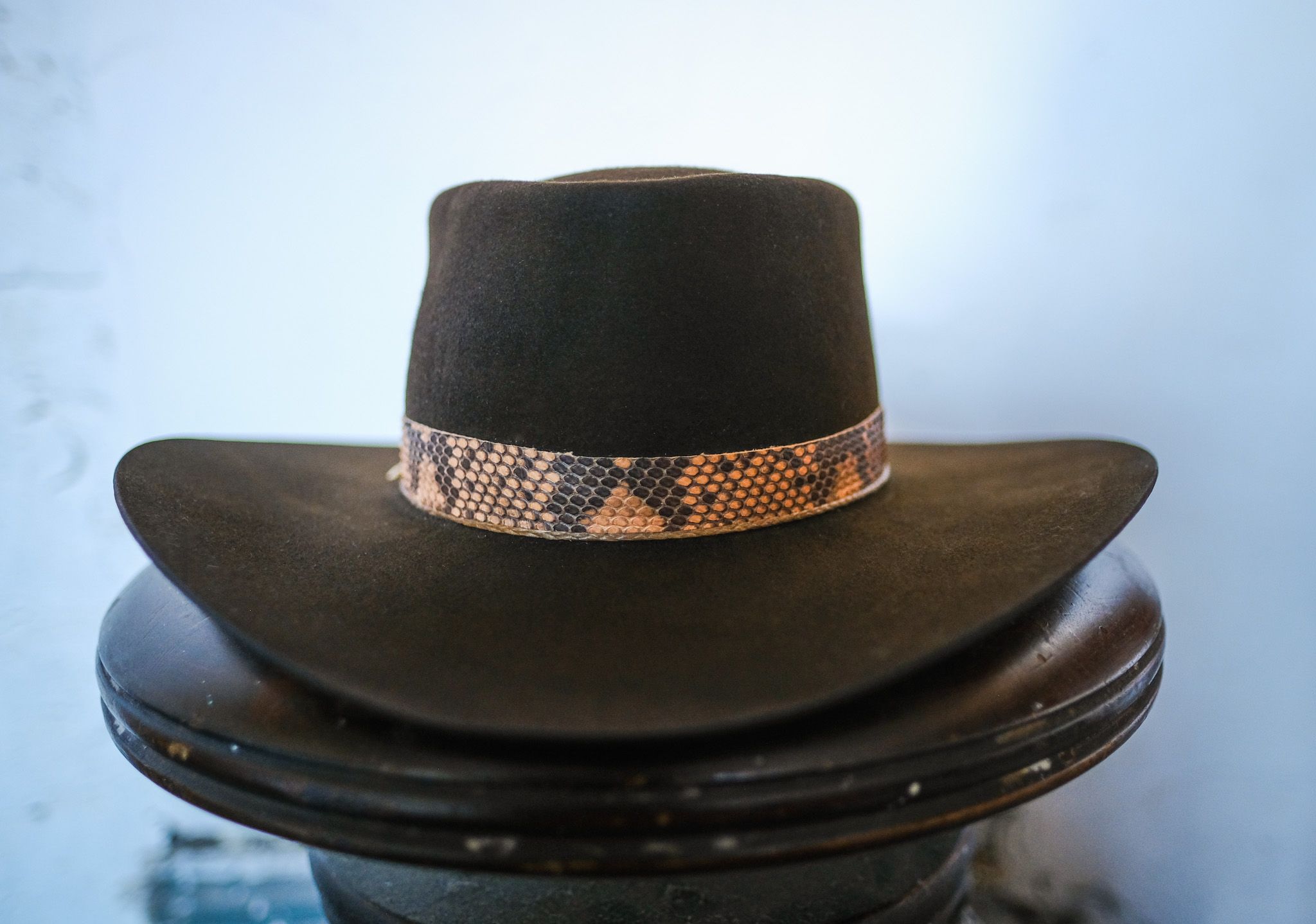 Accoutrements: Python skin band with braided jute twine and our signature gold nail.
